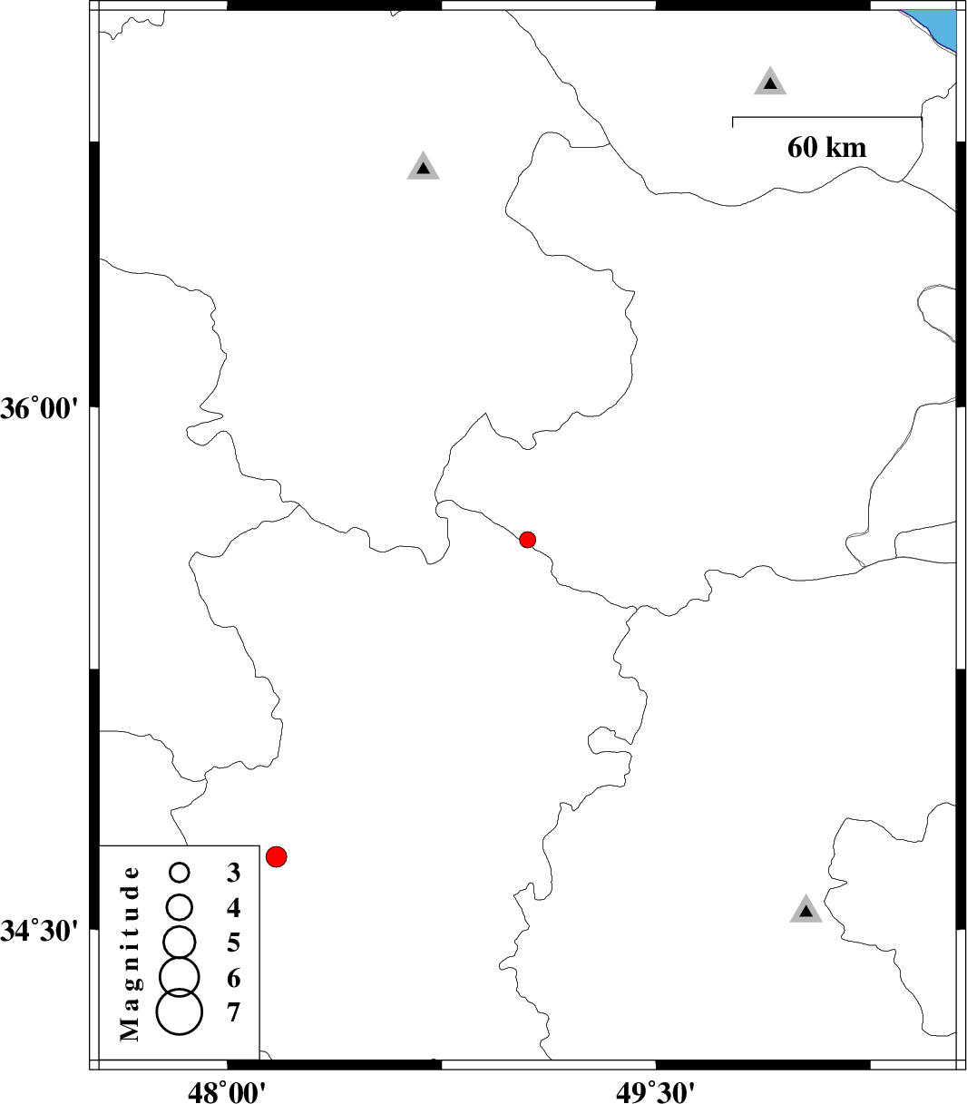 | 2008/10/19 | 08:24:21.5 | 11:54:21.5 | 34.71 | 48.17 | 14 | ML:3.2 | 9 km Asad Abad, Hamedan Province |