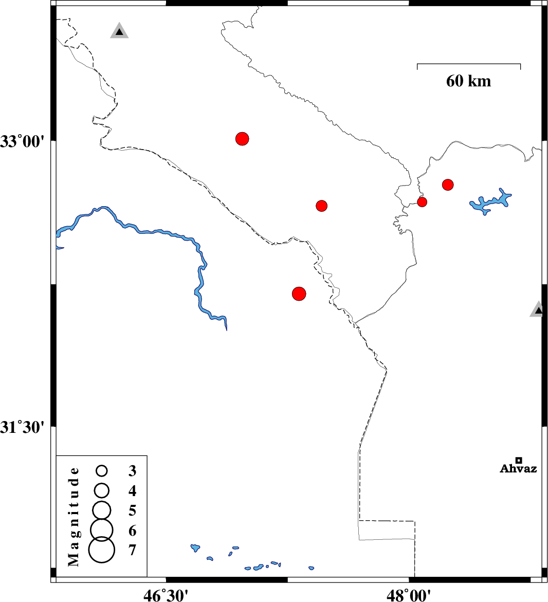| 2008/10/26 | 05:20:25.8 | 08:50:25.8 | 32.2 | 47.32 | 43 | ML:3.8 | 54 km South of Dehloran, Ilam Province | ||
