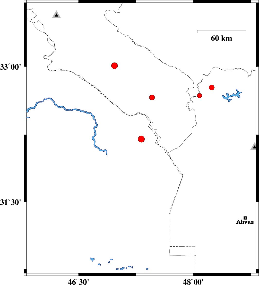 2008/10/26 | 05:20:25.8 | 08:50:25.8 | 32.2 | 47.32 | 43 | ML:3.8 | 54 km South of Dehloran, Ilam Province | ||