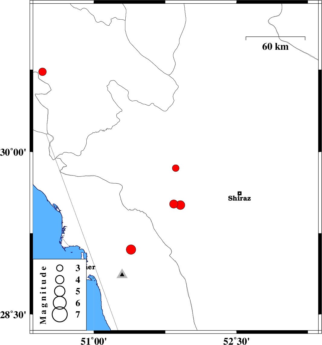 | 2008/10/24 | 05:22:57.9 | 08:52:57.9 | 29.51 | 51.91 | 16 | ML:4.2 | 28 km South-East of Kazerun, Fars Province | ||