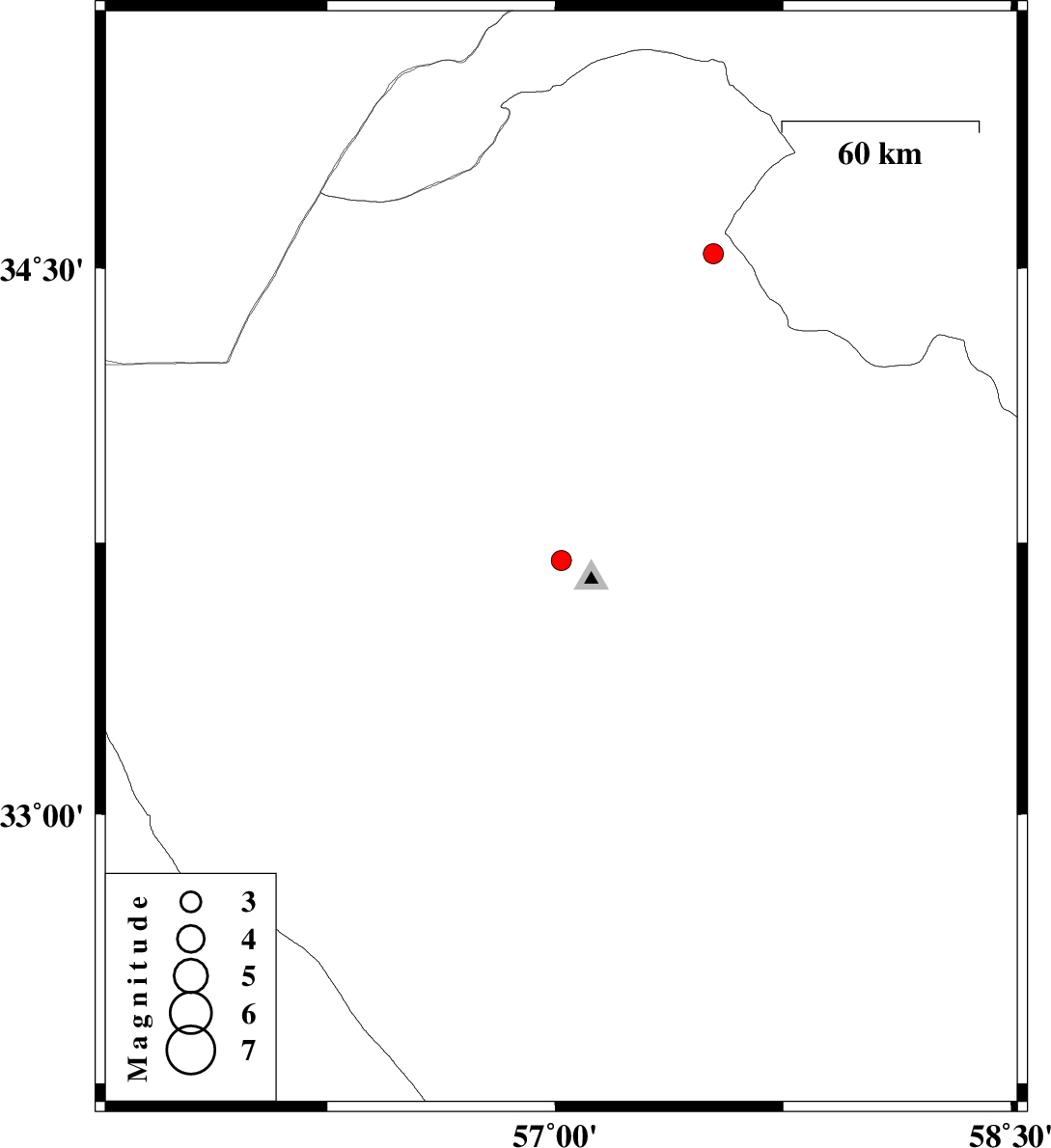 | 2008/10/30 | 14:26:10.0 | 17:56:10.0 | 33.7 | 57.02 | 17 | ML:3 | 14 km North of Tabas, Yazd Province | ||