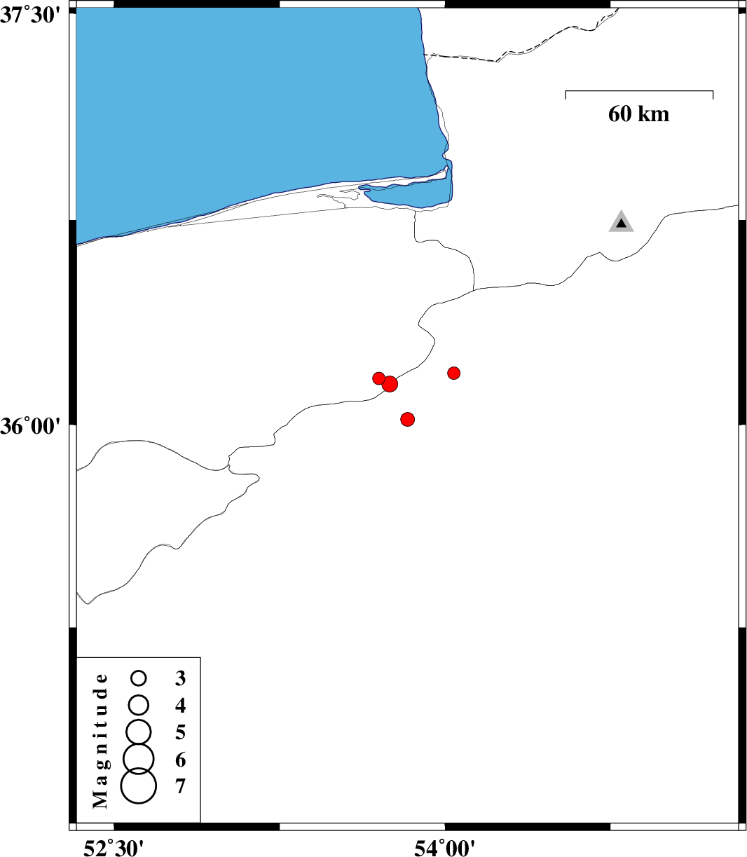2008/10/30 | 22:33:40.3 | 02:03:40.3 | 36.19 | 54.04 | 14 | ML:2.6 | 27 km West of Damghan, Semnan Province |