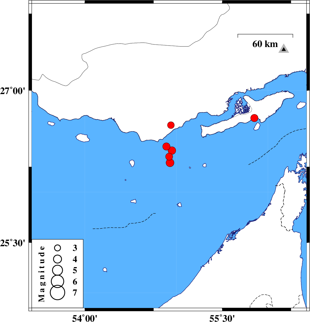 | 2008/10/27 | 02:47:00.7 | 06:17:00.7 | 26.73 | 55.85 | 15 | ML:3.6 | Persian Gulf, 47 km South-West of Qeshm | ||