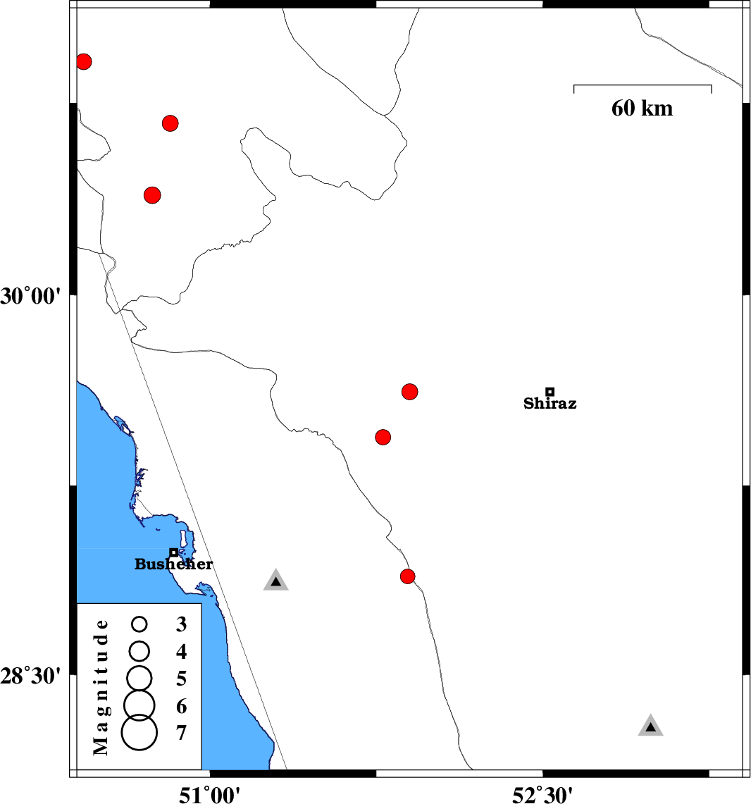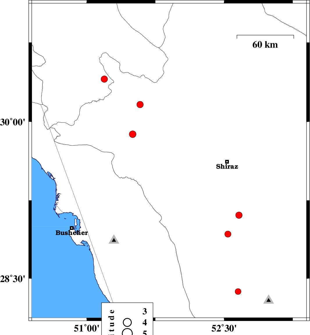 | 2008/11/05 | 09:46:57.3 | 13:16:57.3 | 29.62 | 51.9 | 15 | ML:3.2 | 24 km East of Kazerun, Fars Province | ||