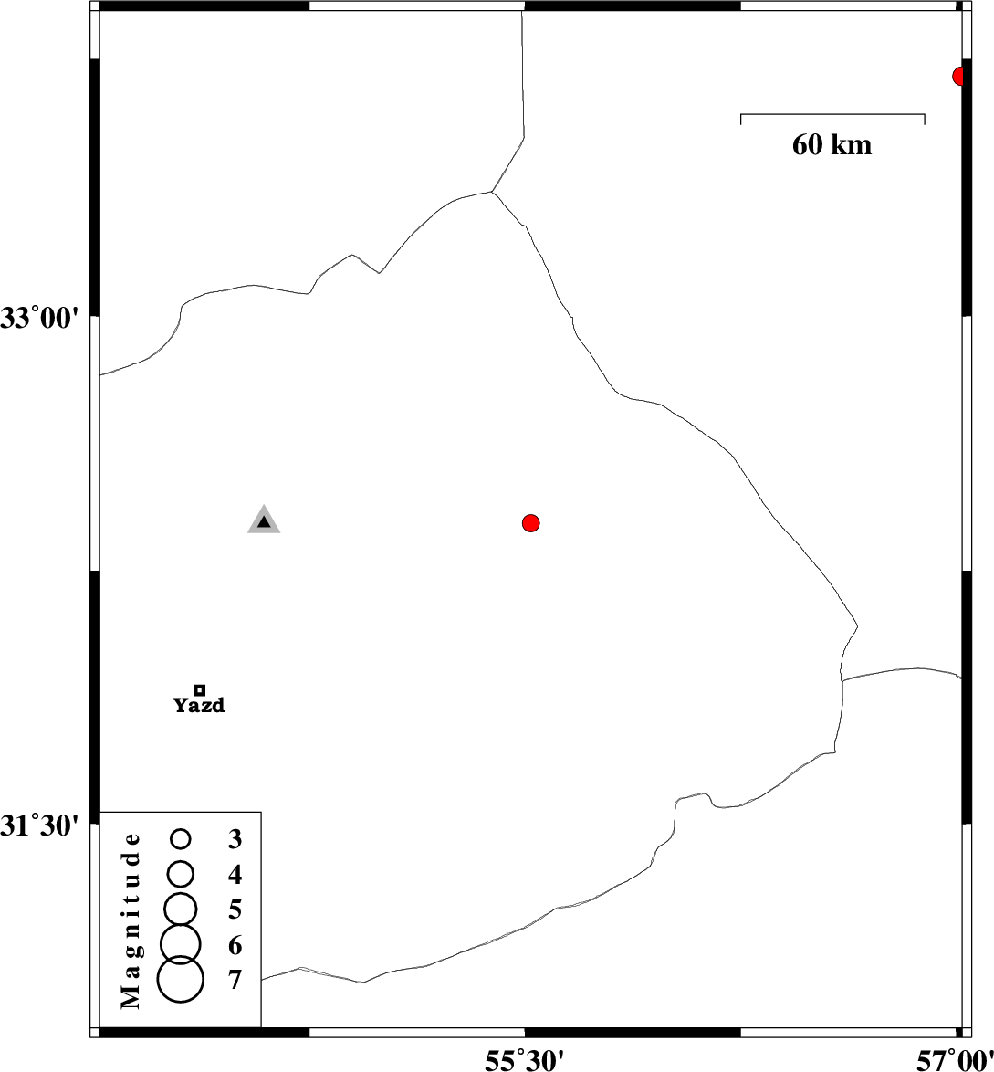 | 2008/11/06 | 10:44:24.3 | 14:14:24.3 | 32.39 | 55.52 | 14 | ML:2.7 | 88 km North-East of Bafq, Yazd Province | ||