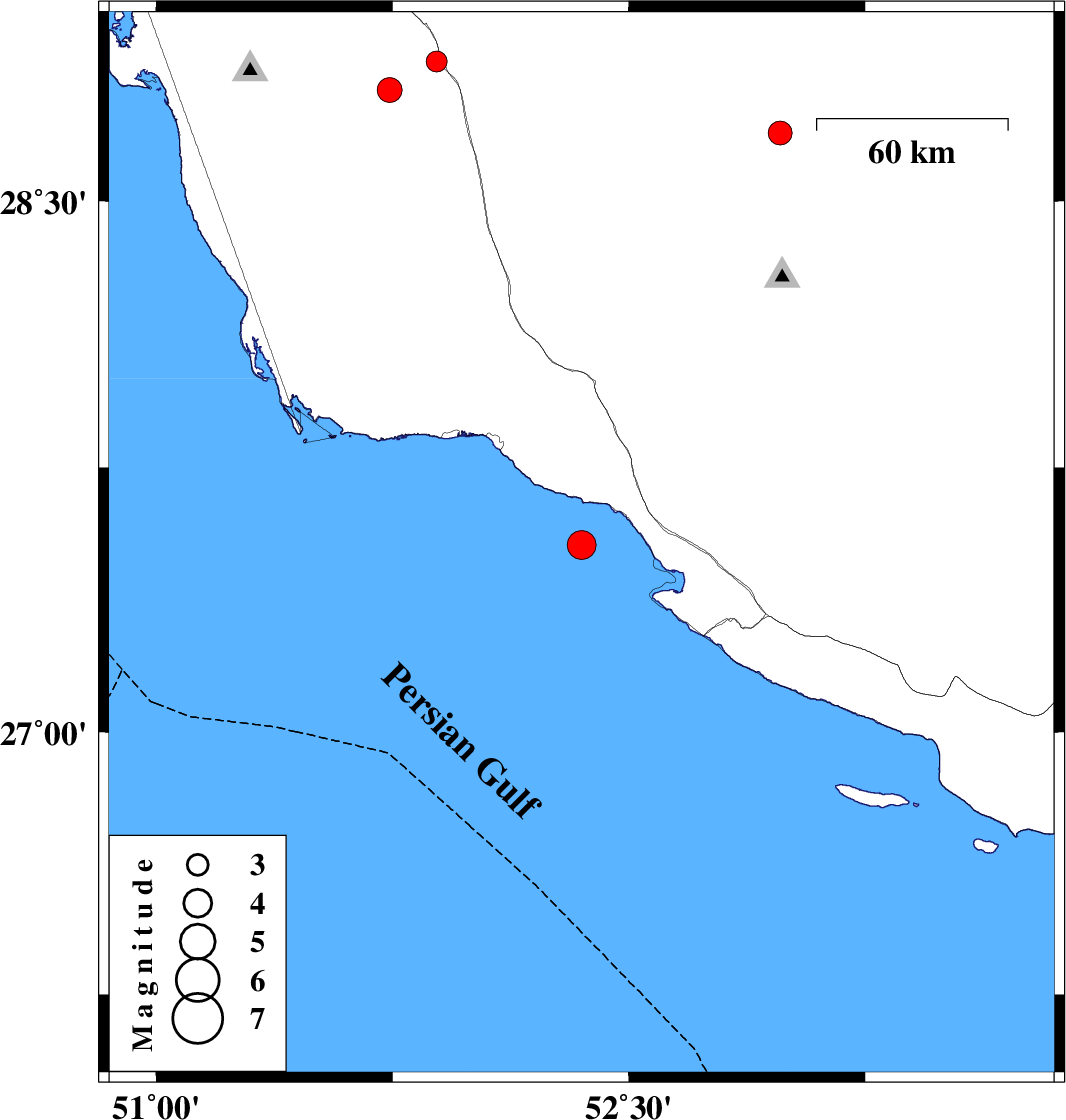 | 2008/11/11 | 13:51:01.1 | 17:21:01.1 | 27.53 | 52.35 | 15 | ML:4.1 | Persian Gulf, 34 km South of Jam | ||