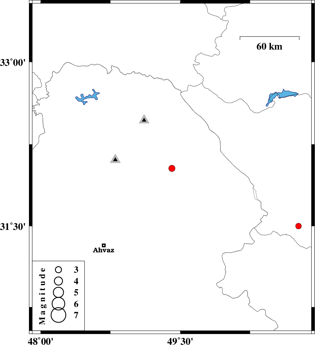 | 2008/11/13 | 04:55:29.8 | 08:25:29.8 | 32.03 | 49.41 | 17 | ML:3.1 | 14 km East of Masjed Soleyman, Khoozestan Province | ||