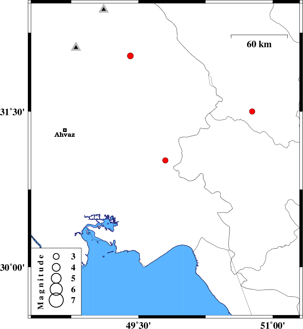 2008/11/15 | 16:33:26.5 | 20:03:26.5 | 31.03 | 49.8 | 39 | ML:2.8 | 31 km North of Omidiyeh, Khoozestan Province | ||