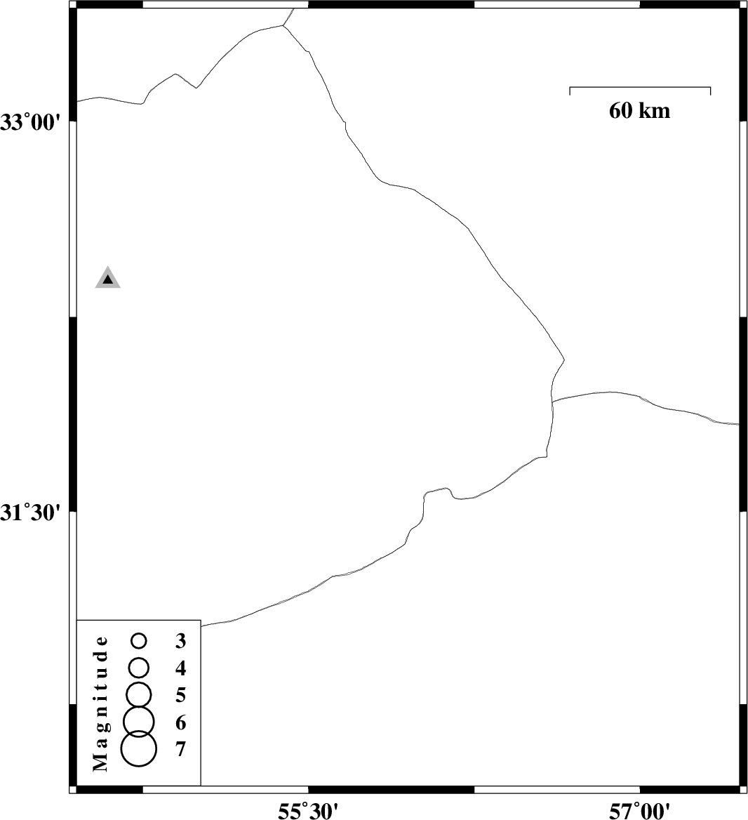 | 2008/11/20 | 04:14:59.2 | 07:44:59.2 | 31.93 | 55.95 | 15 | ML:3 | 63 km North-East of Bafq, Yazd Province |
