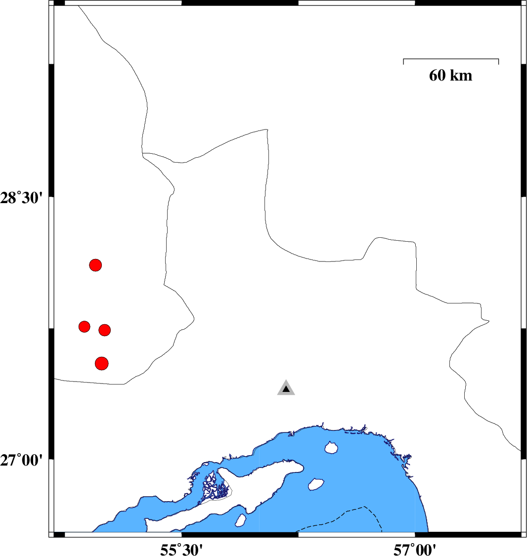 | 2008/10/27 | 02:47:00.7 | 06:17:00.7 | 26.73 | 55.85 | 15 | ML:3.6 | Persian Gulf, 47 km South-West of Qeshm | ||
