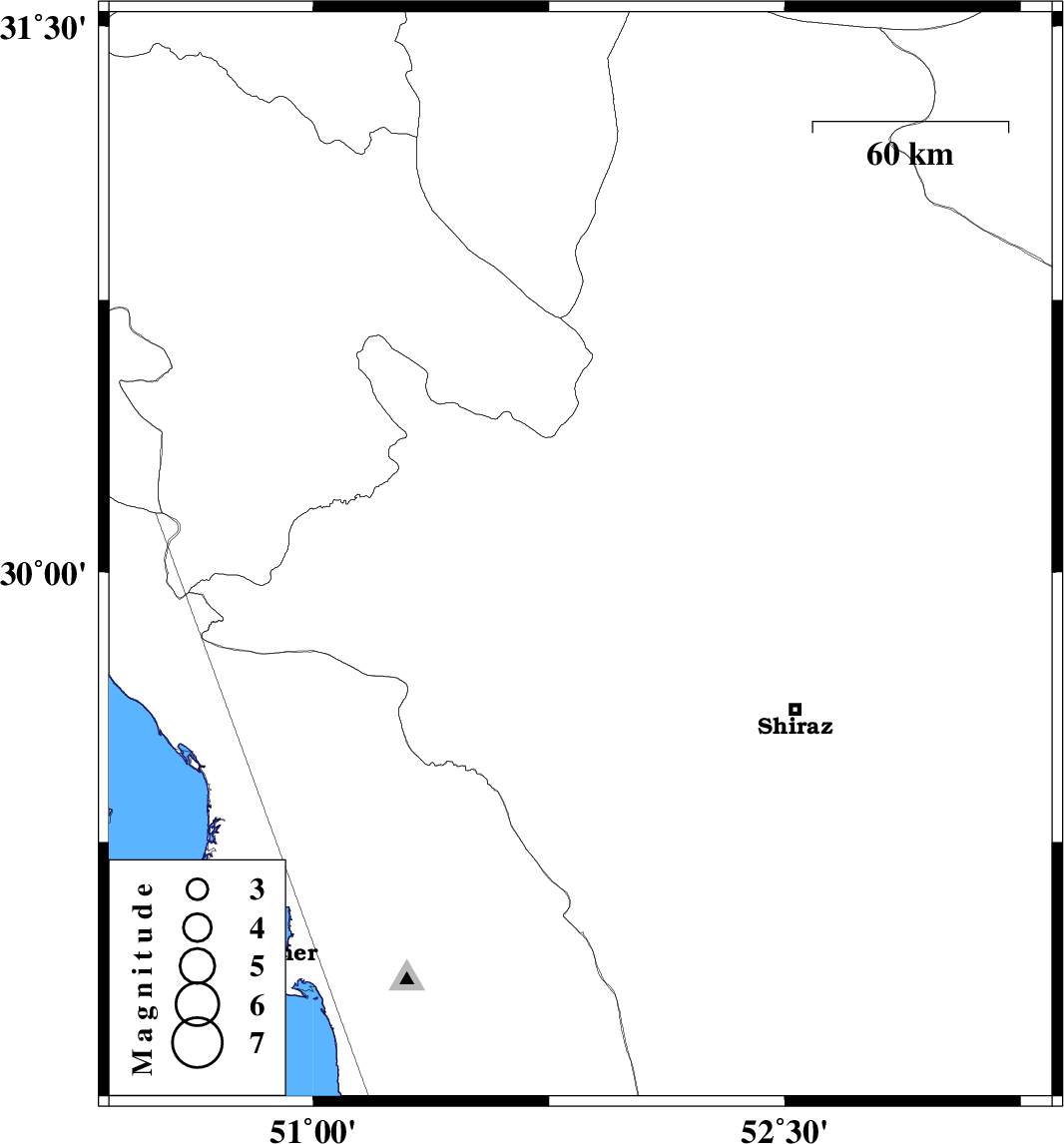 | 2008/11/25 | 22:13:17.7 | 01:43:17.7 | 30.04 | 51.85 | 15 | ML:4.5 | 27 km South-West of Ardakan, Fars Province |