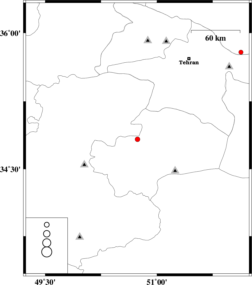 2008/11/14 | 15:22:48.4 | 18:52:48.4 | 35.79 | 52.13 | 14 | ML:2.7 | 9 km Damavand, Tehran Province |
