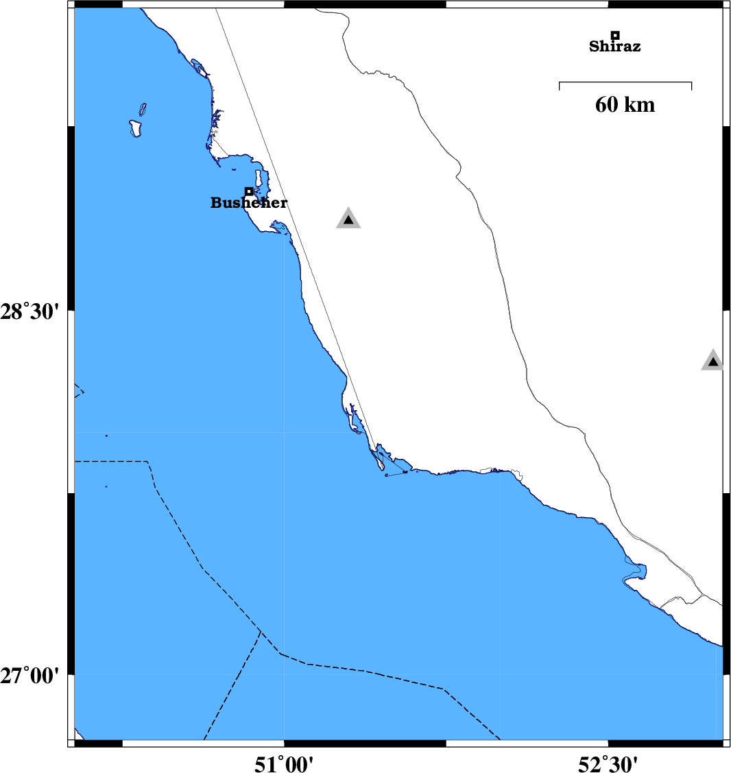 | 2008/11/11 | 13:51:01.1 | 17:21:01.1 | 27.53 | 52.35 | 15 | ML:4.1 | Persian Gulf, 34 km South of Jam | ||