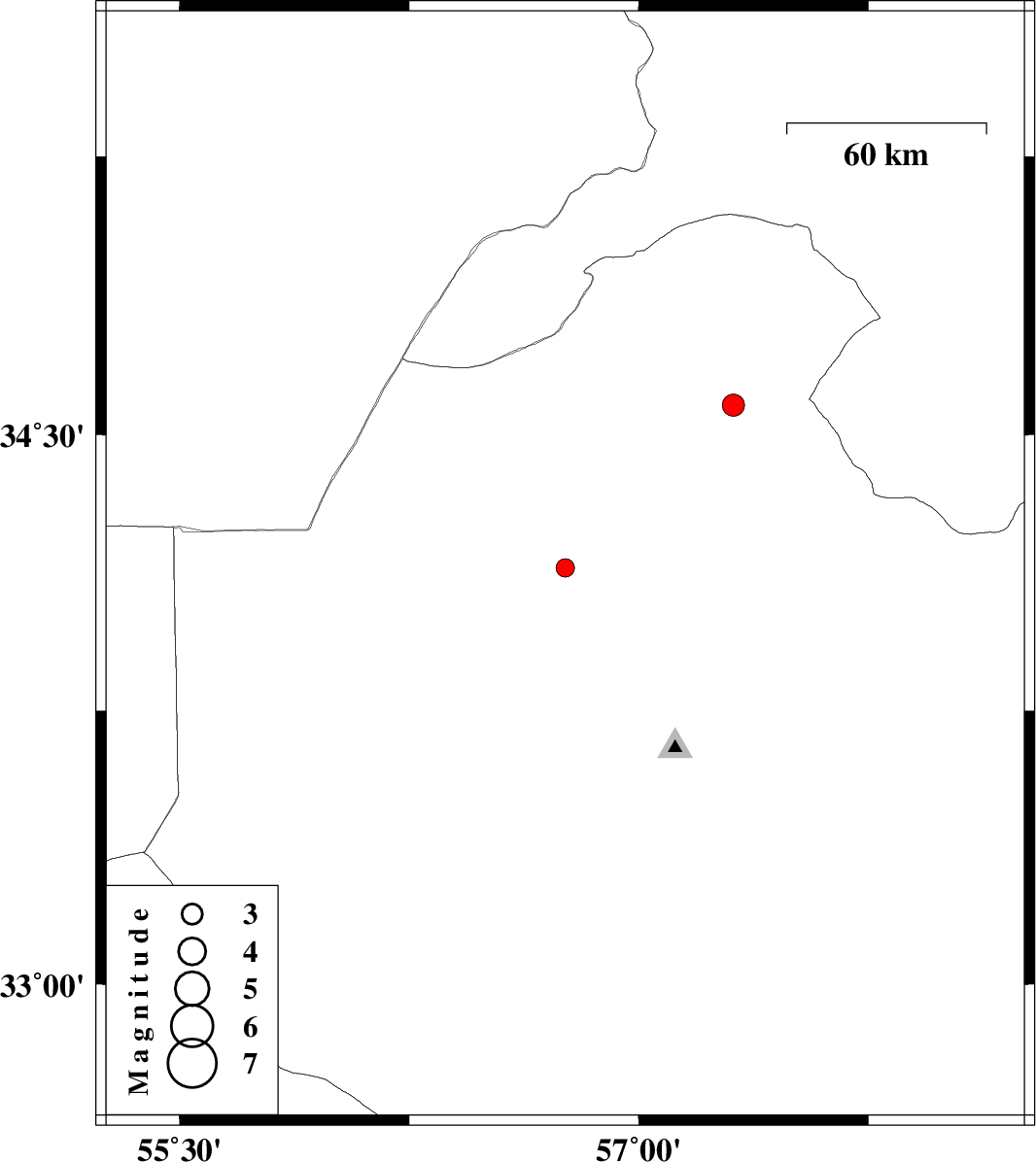 | 2008/11/29 | 03:41:46.3 | 07:11:46.3 | 34.58 | 57.31 | 16 | ML:3.3 | 96 km South-West of Bardeskan, Khorasan(center) Province |