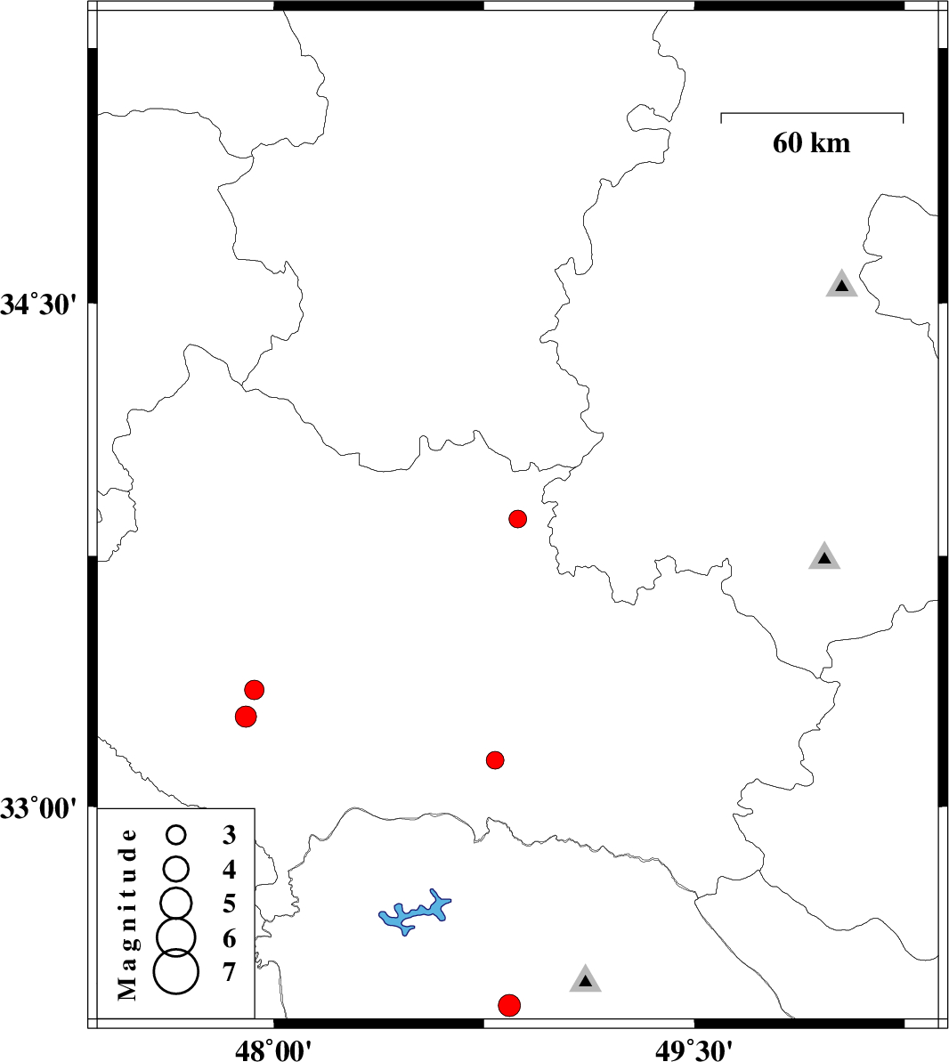 | 2008/11/23 | 06:59:52.3 | 10:29:52.3 | 33.27 | 47.9 | 37 | ML:3.4 | 21 km North-East of Pol-e dokhtar, Lorestan Province | ||