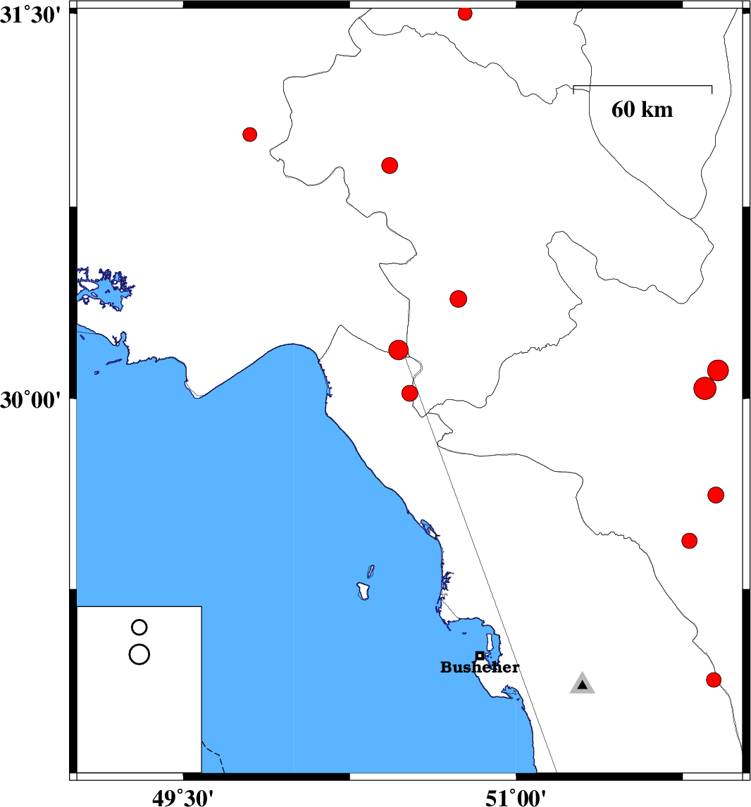 2008/11/05 | 12:52:55.9 | 16:22:55.9 | 28.89 | 51.89 | 15 | ML:2.9 | 18 km West of Farashband, Fars Province | ||