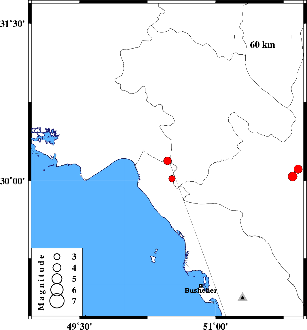 | 2008/11/25 | 22:13:17.7 | 01:43:17.7 | 30.04 | 51.85 | 15 | ML:4.5 | 27 km South-West of Ardakan, Fars Province |