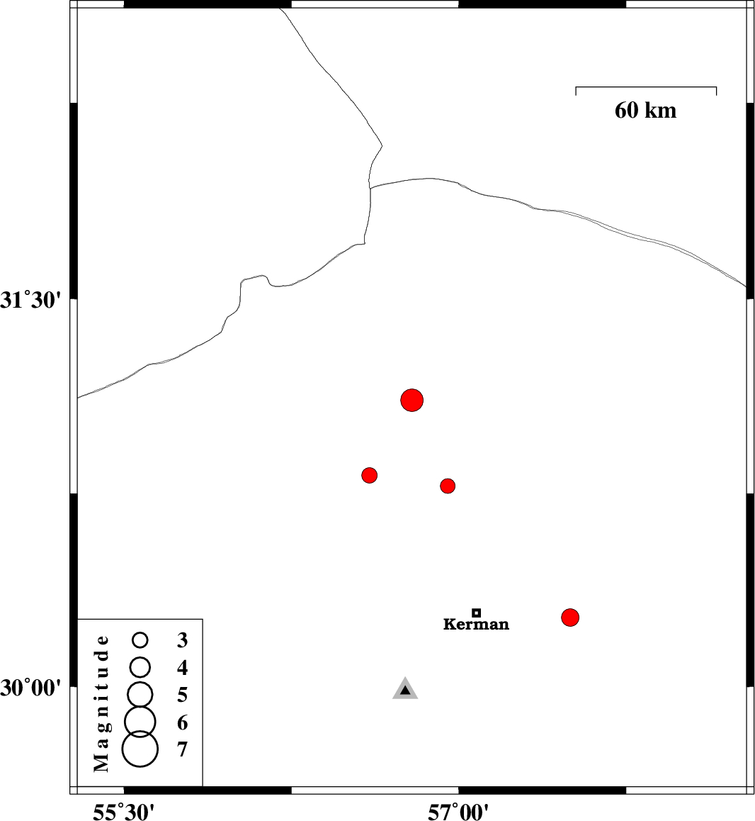 | 2008/11/30 | 01:18:03.8 | 04:48:03.8 | 30.78 | 56.95 | 14 | ML:3 | 36 km East of Zarand, Kerman Province | ||