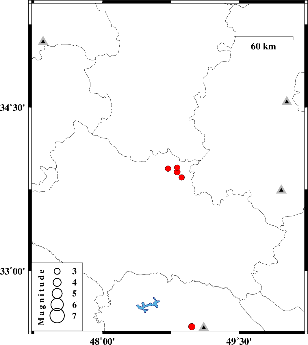| 2008/12/01 | 00:39:59.1 | 04:09:59.1 | 33.86 | 48.87 | 15 | ML:2.8 | 10 km East of Borujerd, Lorestan Province |