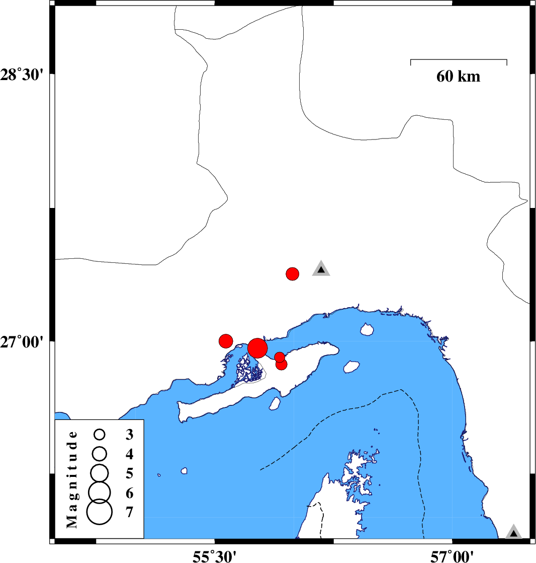 | 2008/12/07 | 13:36:20.8 | 17:06:20.8 | 26.96 | 55.77 | 11 | Mb:5.6 | Persian Gulf, 49 km West of Qeshm | ||