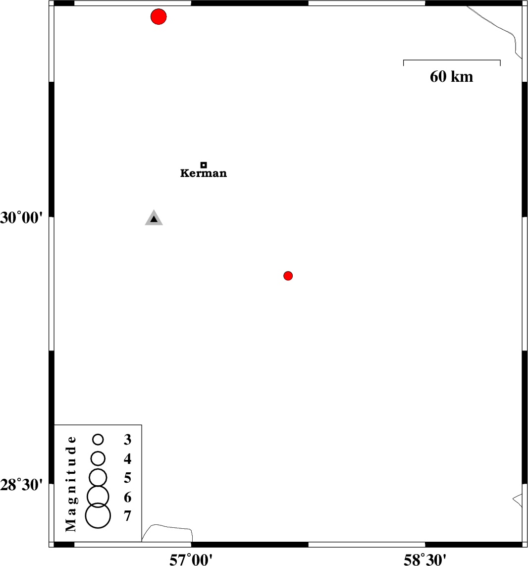 | 2008/12/09 | 18:50:59.9 | 22:20:59.9 | 29.67 | 57.62 | 18 | ML:2.6 | 86 km South-East of Kerman, Kerman Province | ||