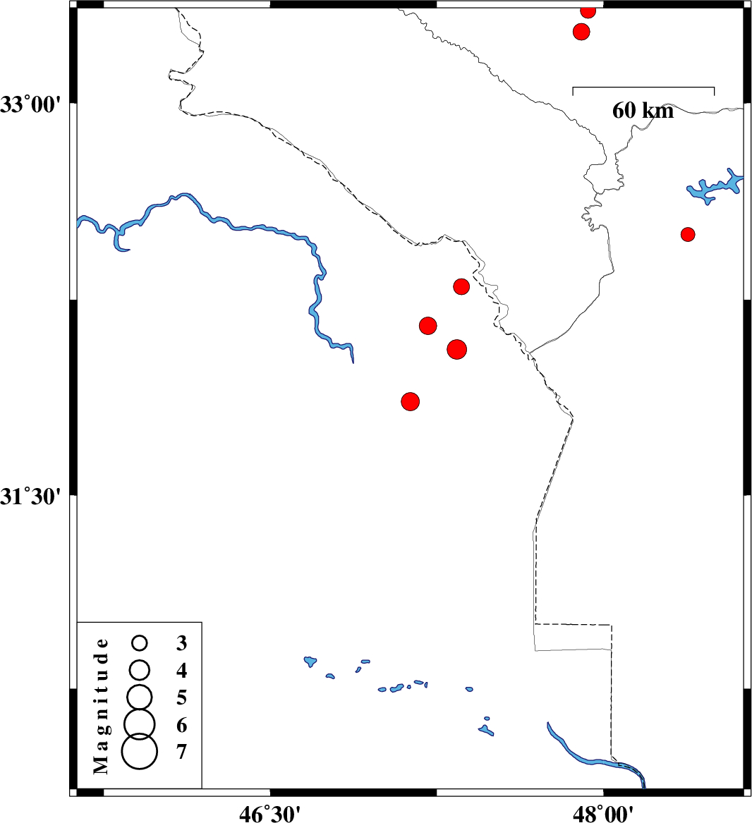 | 2008/11/13 | 19:07:54.5 | 22:37:54.5 | 32.15 | 47.21 | 39 | ML:3.5 | 60 km South of Dehloran, Ilam Province |