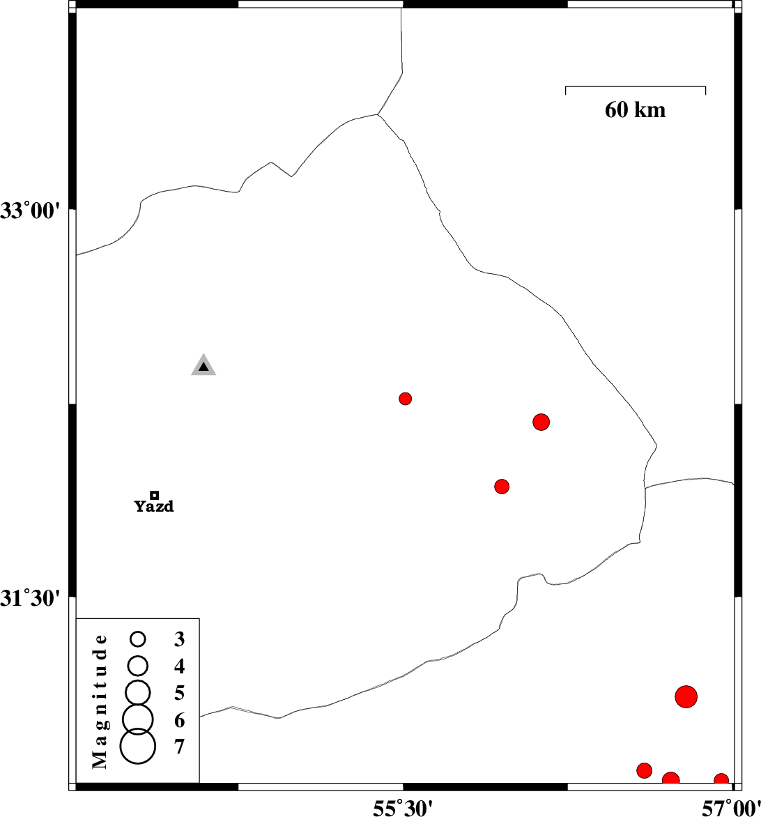 | 2008/11/20 | 04:14:59.2 | 07:44:59.2 | 31.93 | 55.95 | 15 | ML:3 | 63 km North-East of Bafq, Yazd Province |