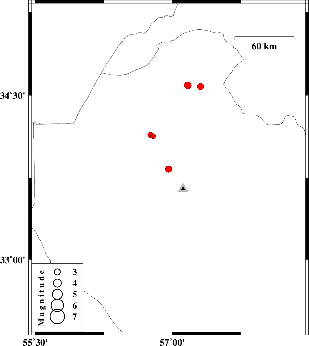 | 2008/12/05 | 08:09:53.1 | 11:39:53.1 | 34.59 | 57.17 | 33 | ML:3.5 | 102 km South-West of Bardeskan, Khorasan(center) Province | ||
