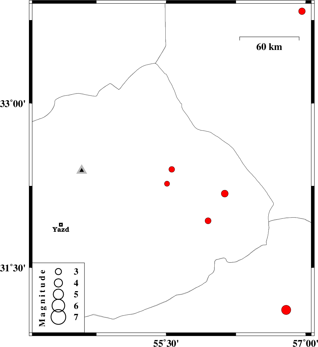 | 2008/11/20 | 04:14:59.2 | 07:44:59.2 | 31.93 | 55.95 | 15 | ML:3 | 63 km North-East of Bafq, Yazd Province |