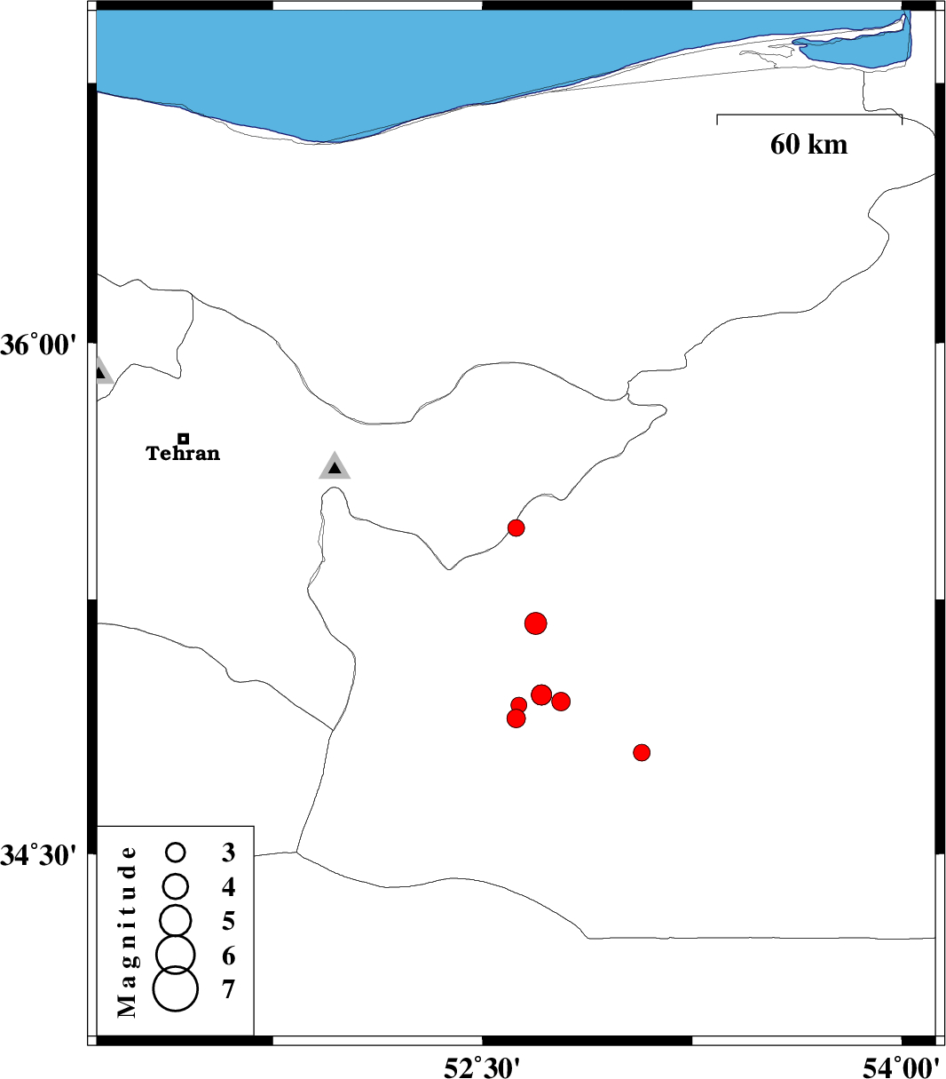 | 2008/11/27 | 03:59:09.6 | 07:29:09.6 | 34.95 | 52.78 | 14 | ML:3 | 49 km South-East of Garmsar, Semnan Province |