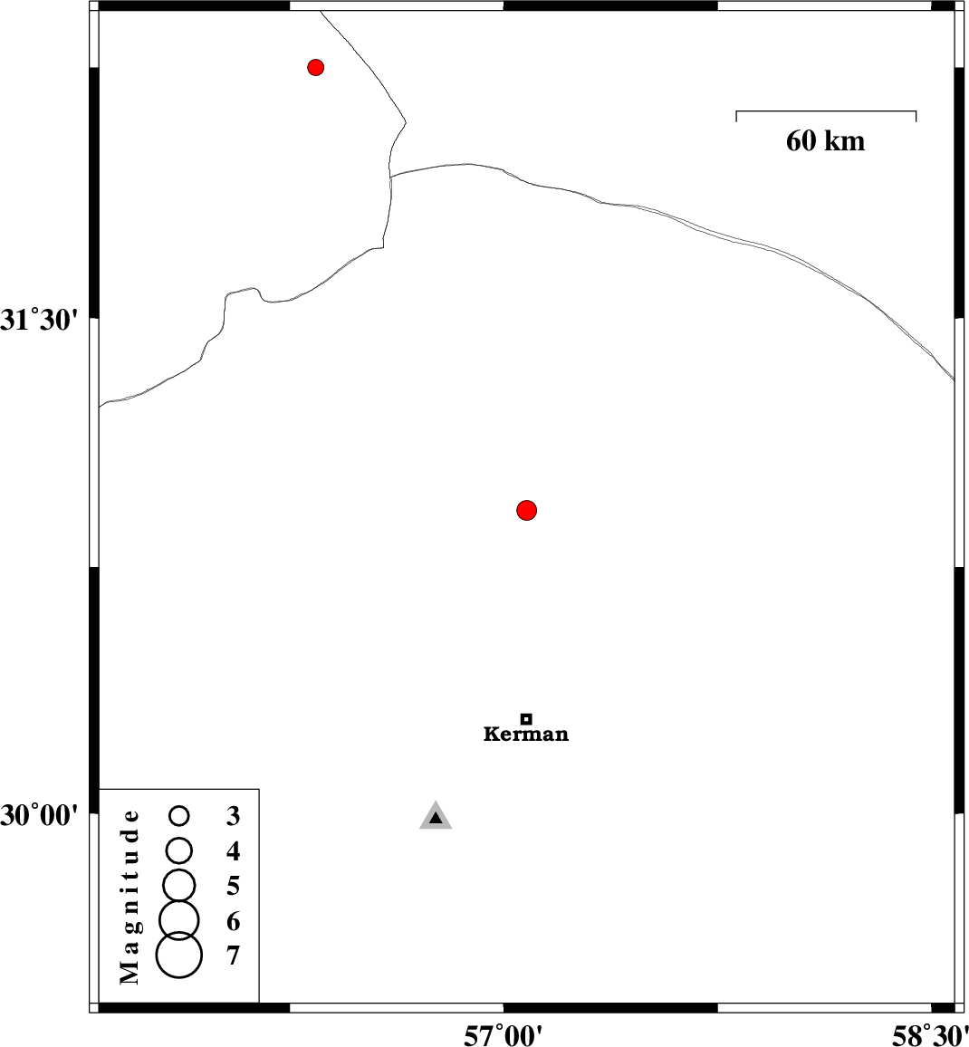 | 2008/12/20 | 06:13:06.3 | 09:43:06.3 | 30.92 | 57.08 | 15 | ML:3.1 | 45 km South-East of Ravar, Kerman Province | ||