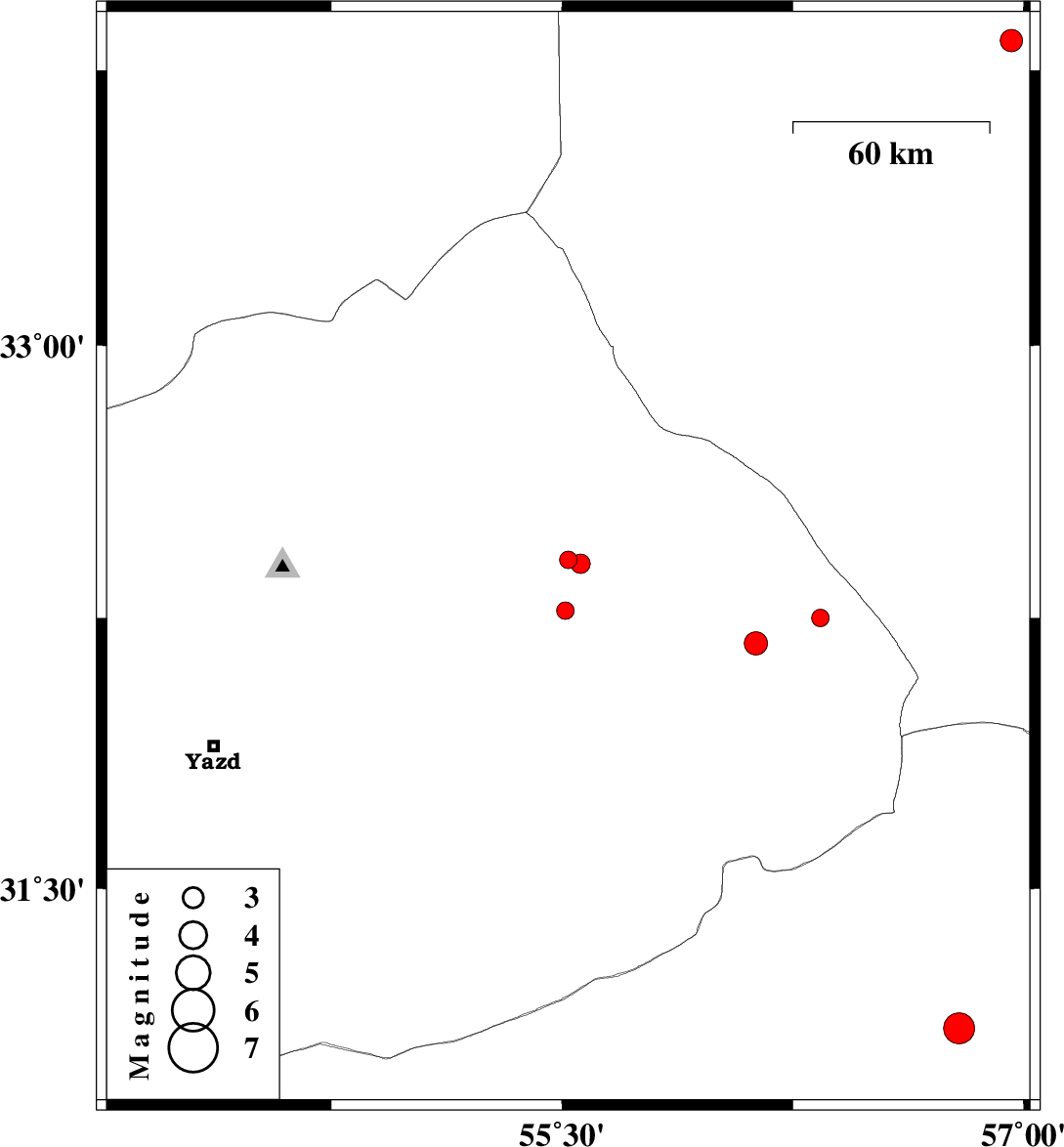 | 2008/12/15 | 13:18:30.5 | 16:48:30.5 | 32.27 | 55.51 | 14 | ML:2.5 | 74 km North-East of Bafq, Yazd Province | ||