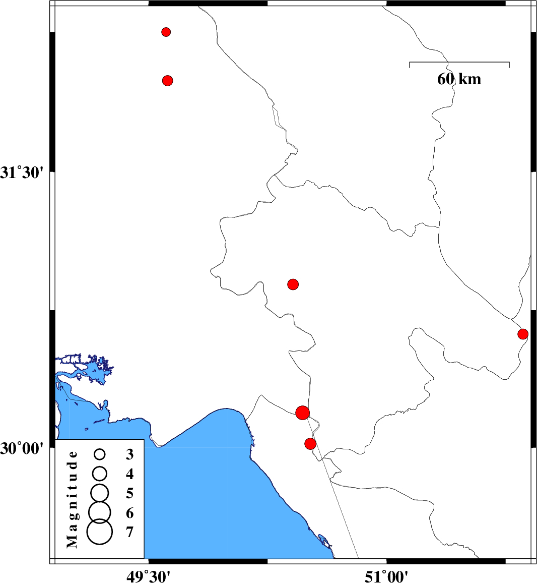 | 2008/12/01 | 16:02:37.3 | 19:32:37.3 | 30.02 | 50.52 | 18 | ML:3.2 | 45 km South-West of Dogonbadan, Kohkiluieh va boyerahmad Province |
