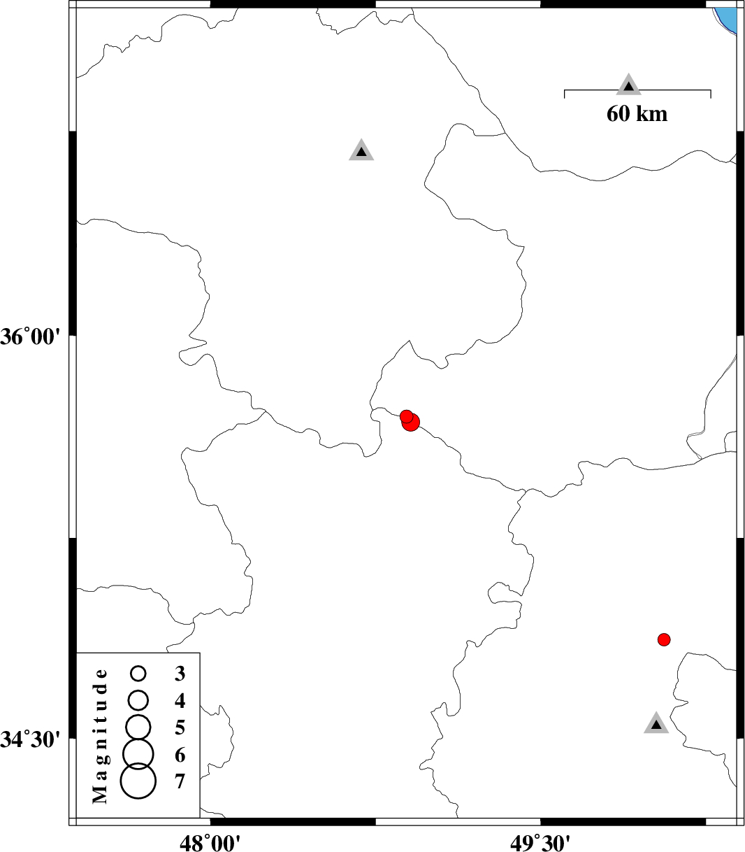 | 2008/12/12 | 05:04:03.0 | 08:34:03.0 | 34.87 | 50.06 | 17 | ML:2.5 | 20 km North of Tafresh, Markazi Province |