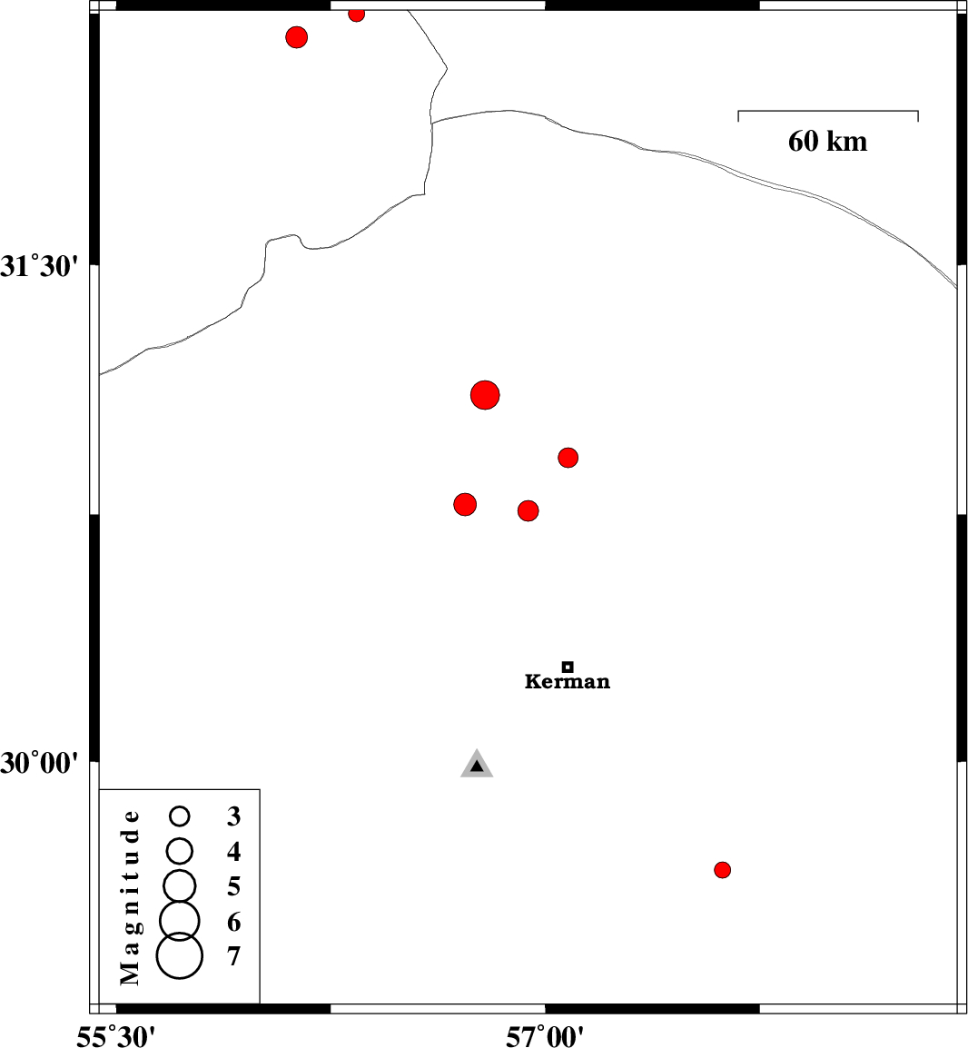 | 2008/12/09 | 18:50:59.9 | 22:20:59.9 | 29.67 | 57.62 | 18 | ML:2.6 | 86 km South-East of Kerman, Kerman Province | ||