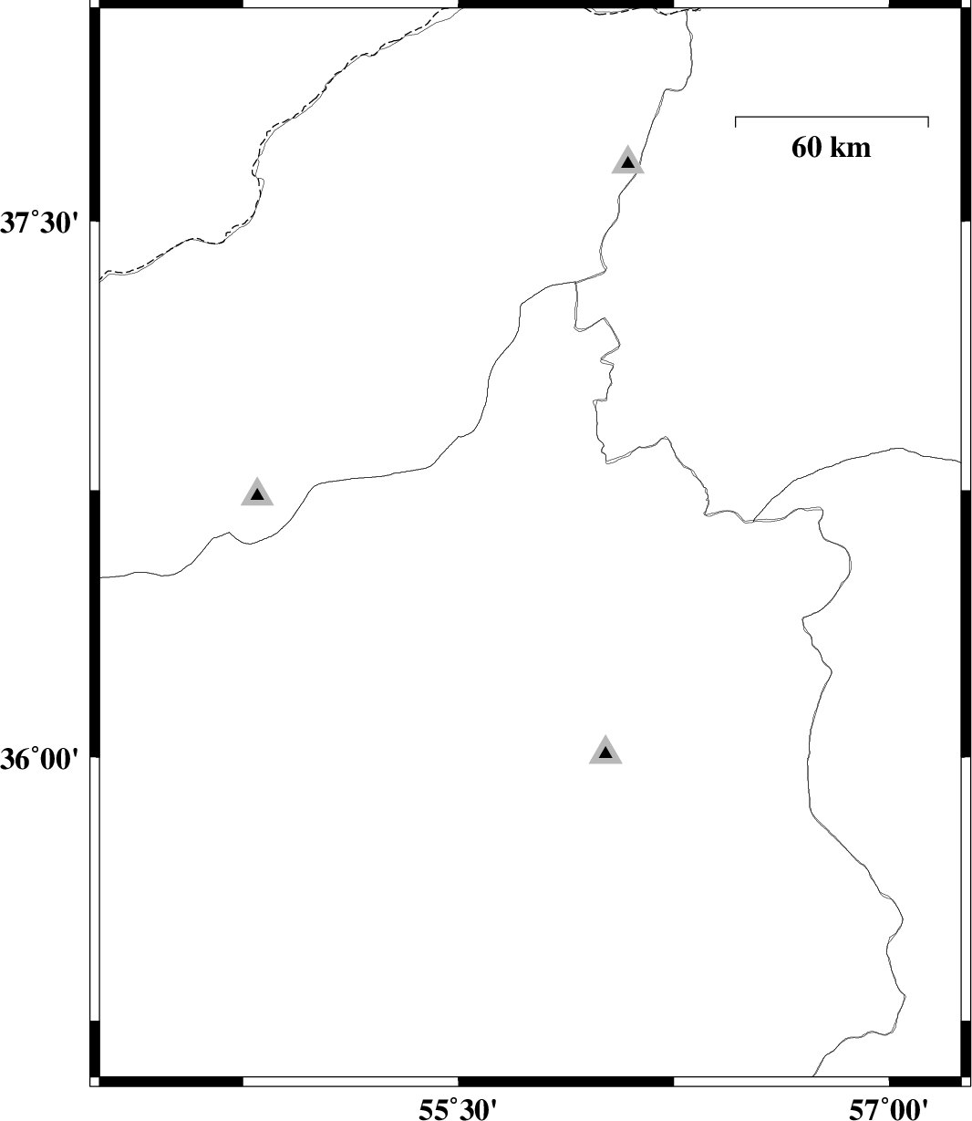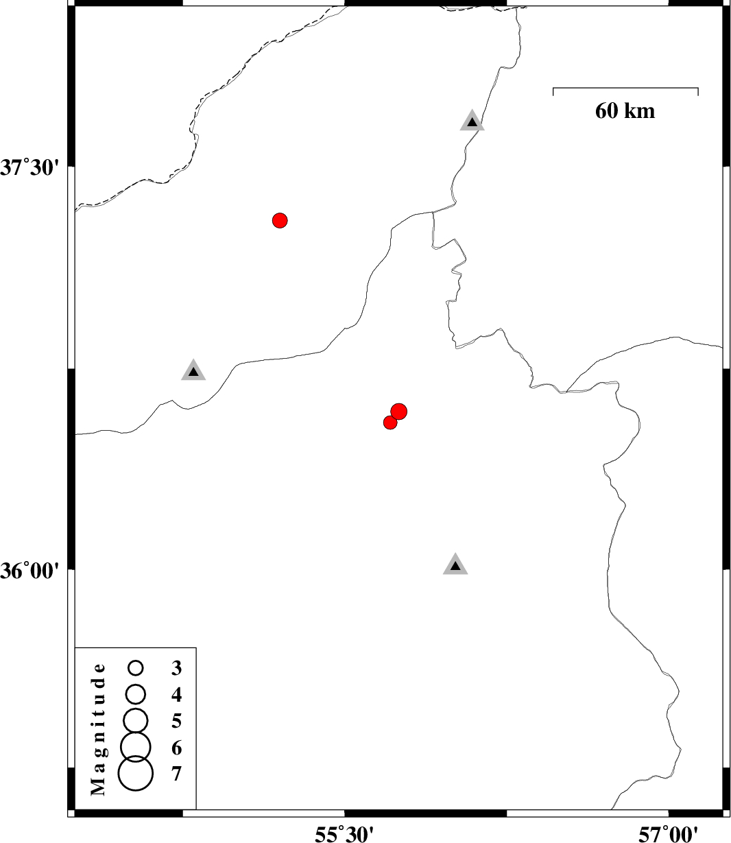 | 2009/01/03 | 15:08:45.7 | 18:38:45.7 | 36.59 | 55.75 | 14 | ML:3.4 | 69 km South-West of Jajarm, Khorasan(north) Province | ||