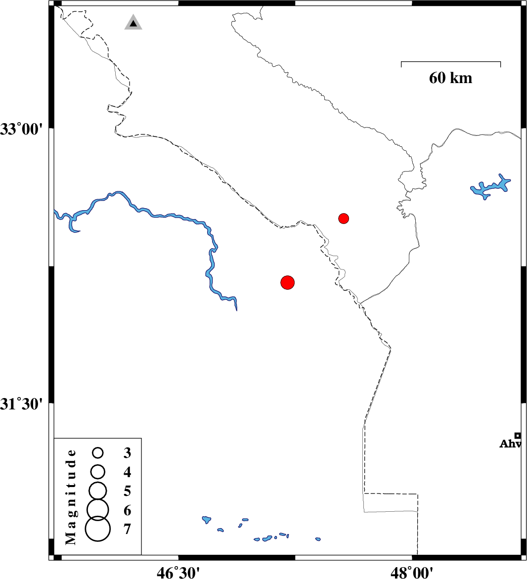| 2008/12/28 | 21:28:24.1 | 00:58:24.1 | 32.51 | 47.56 | 37 | ML:3 | 34 km South-East of Dehloran, Ilam Province |