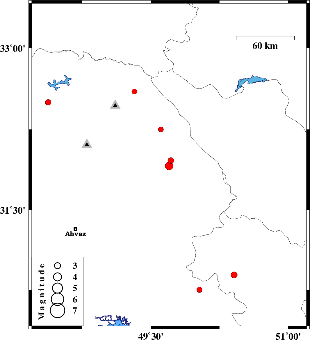 | 2009/01/07 | 01:19:01.3 | 04:49:01.3 | 31.91 | 49.7 | 45 | ML:4 | 17 km West of Izeh, Khoozestan Province | ||