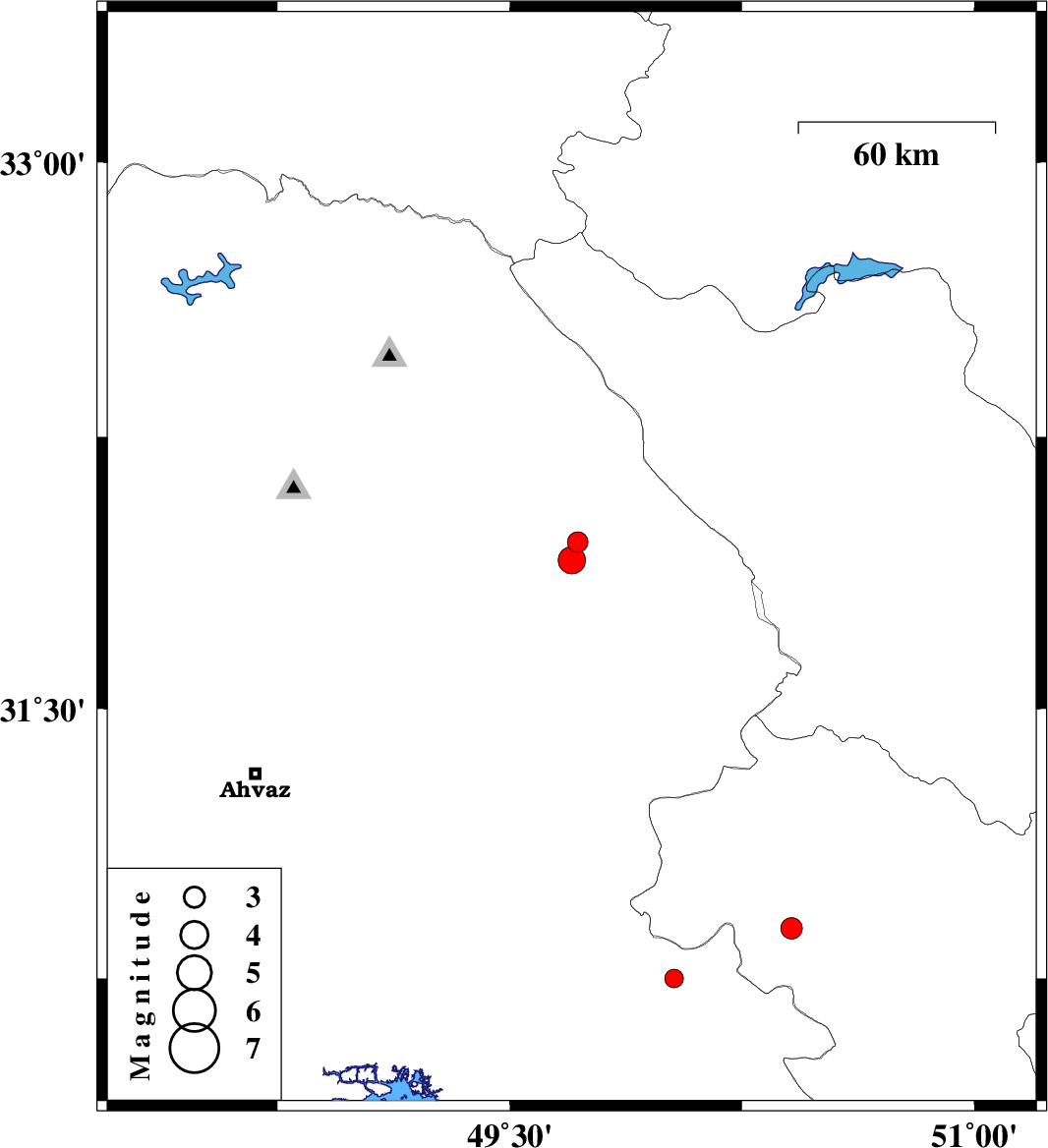 | 2009/01/07 | 01:19:01.3 | 04:49:01.3 | 31.91 | 49.7 | 45 | ML:4 | 17 km West of Izeh, Khoozestan Province | ||