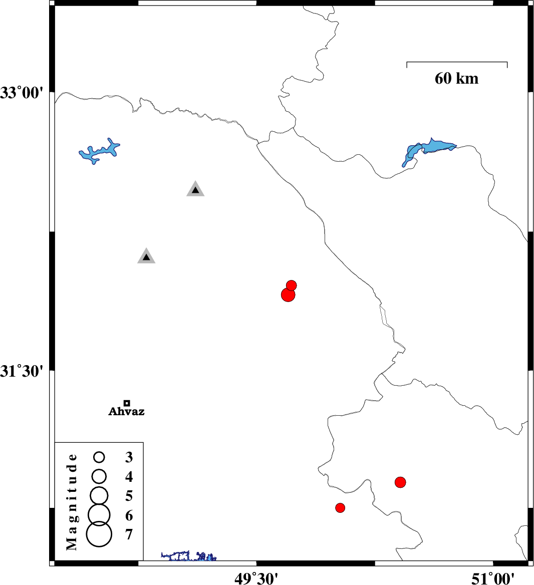 | 2009/01/07 | 01:19:01.3 | 04:49:01.3 | 31.91 | 49.7 | 45 | ML:4 | 17 km West of Izeh, Khoozestan Province | ||