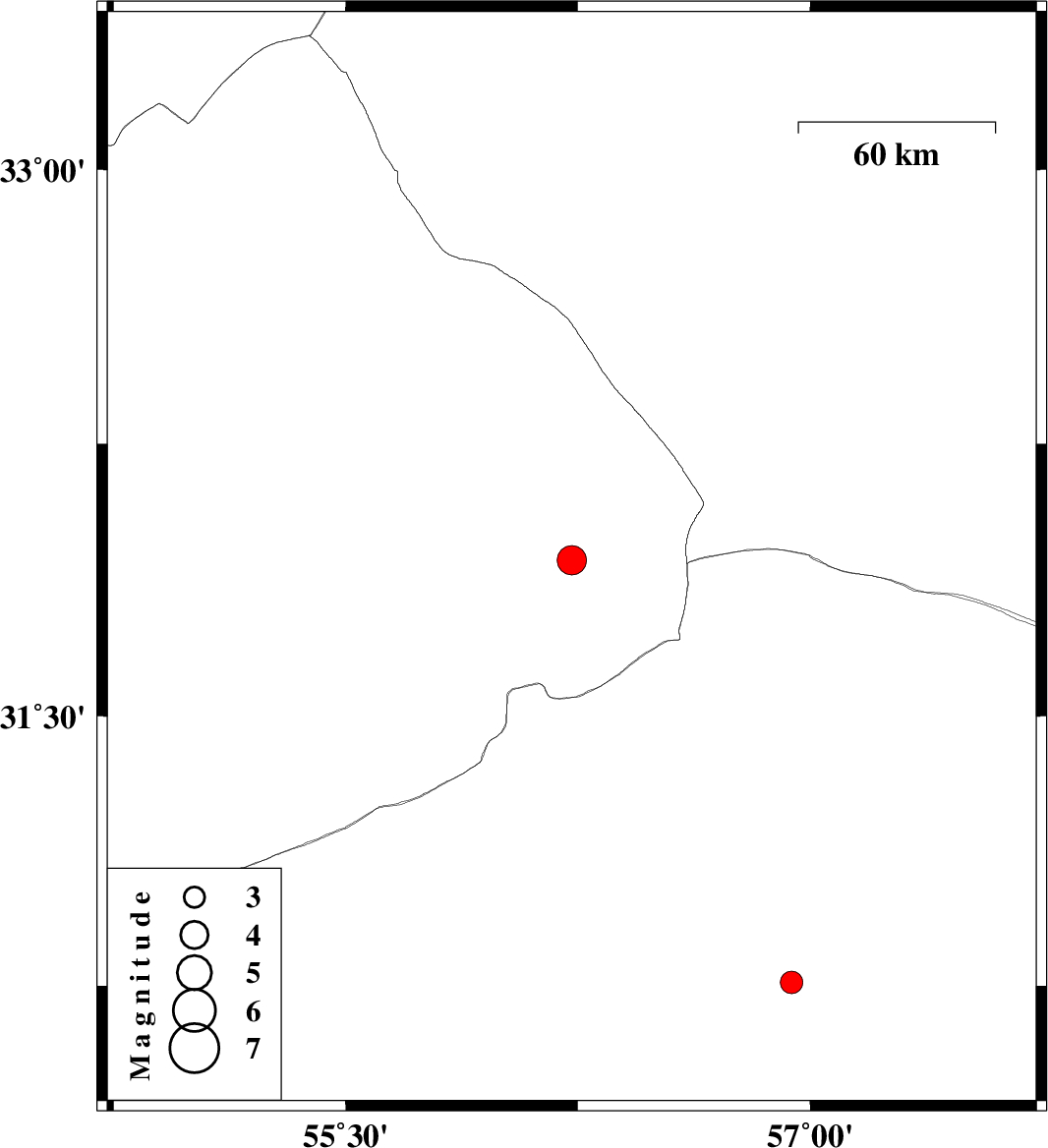 | 2009/01/08 | 08:57:30.4 | 12:27:30.4 | 31.93 | 56.23 | 14 | ML:4.2 | 86 km North-East of Bafq, Yazd Province | ||