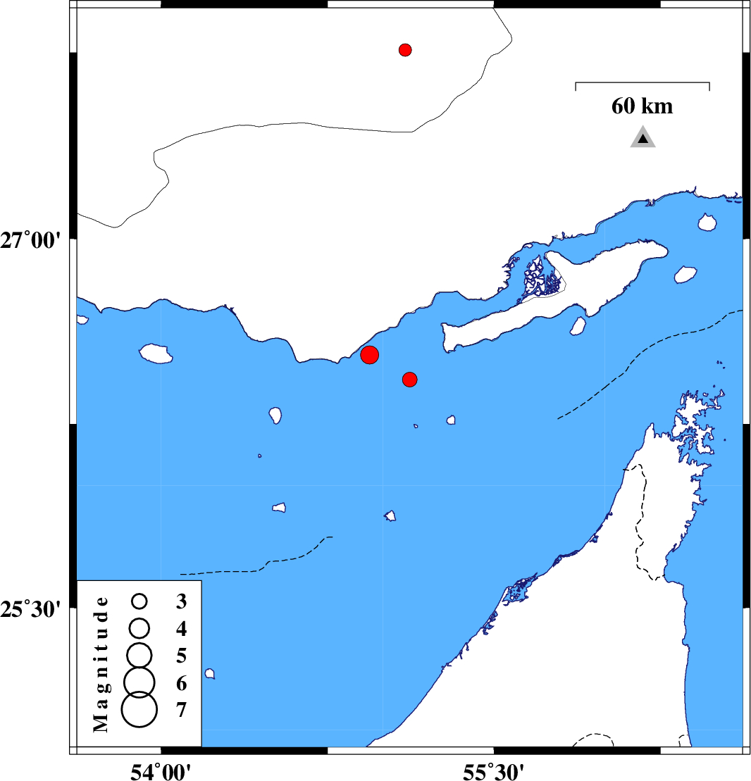 | 2009/01/08 | 23:05:02.0 | 02:35:02.0 | 26.43 | 55.12 | 14 | ML:3 | Persian Gulf, 28 km East of Bandar-e lengeh | ||