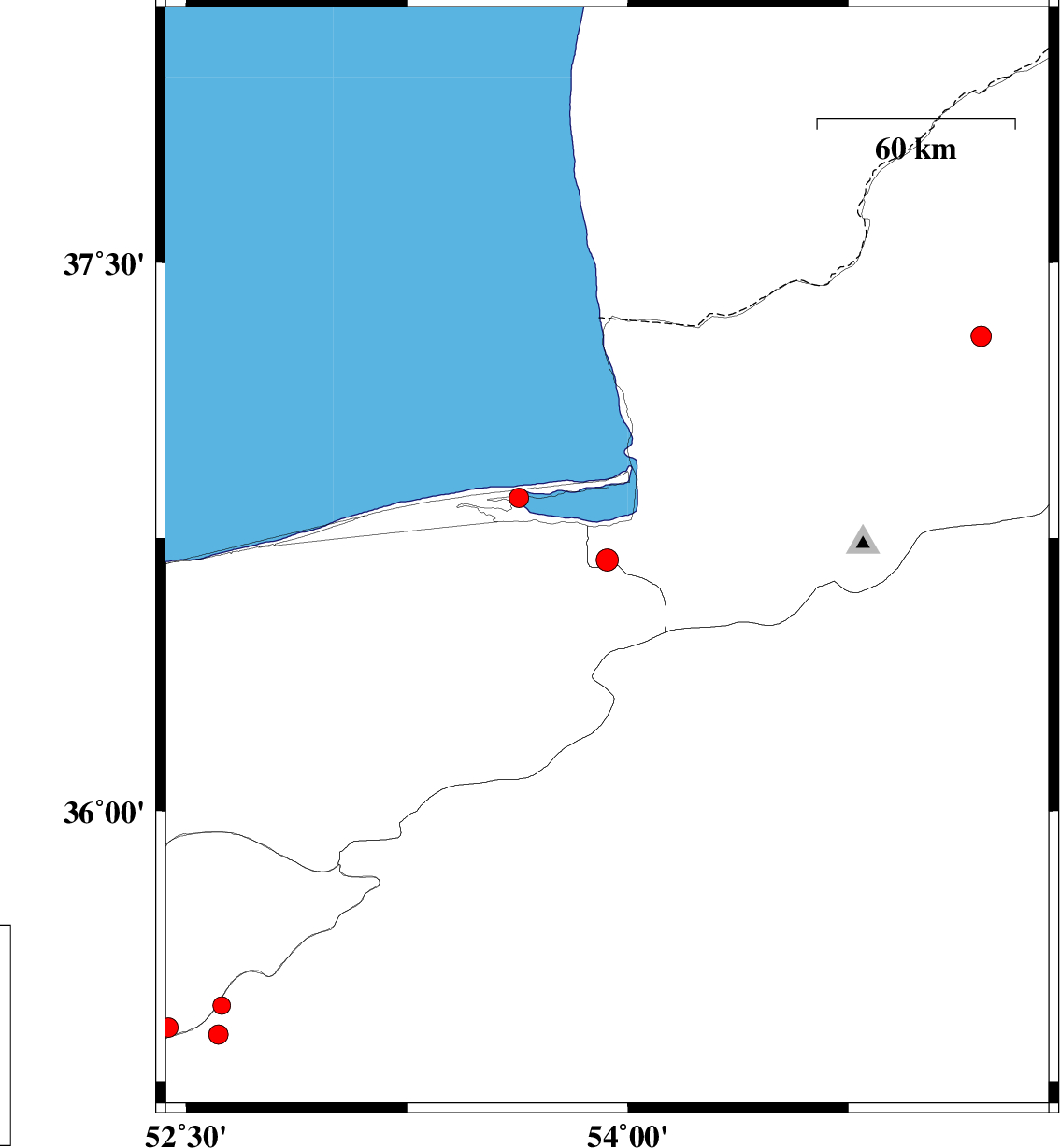 | 2008/12/27 | 03:15:17.9 | 06:45:17.9 | 36.86 | 53.63 | 15 | ML:3 | Caspian Sea, 20 km North of Behshahr | ||