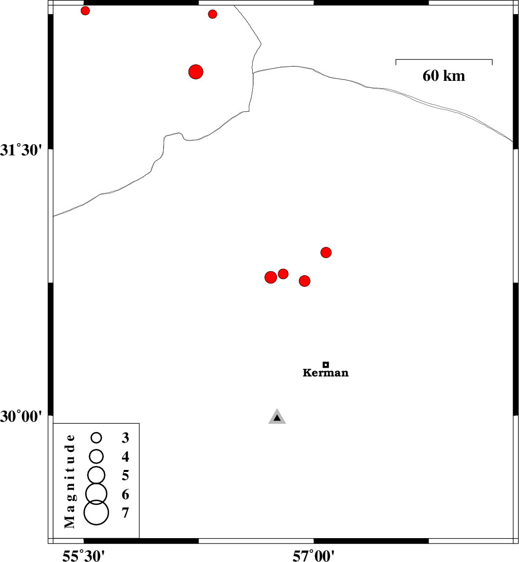 | 2008/12/20 | 06:13:06.3 | 09:43:06.3 | 30.92 | 57.08 | 15 | ML:3.1 | 45 km South-East of Ravar, Kerman Province | ||