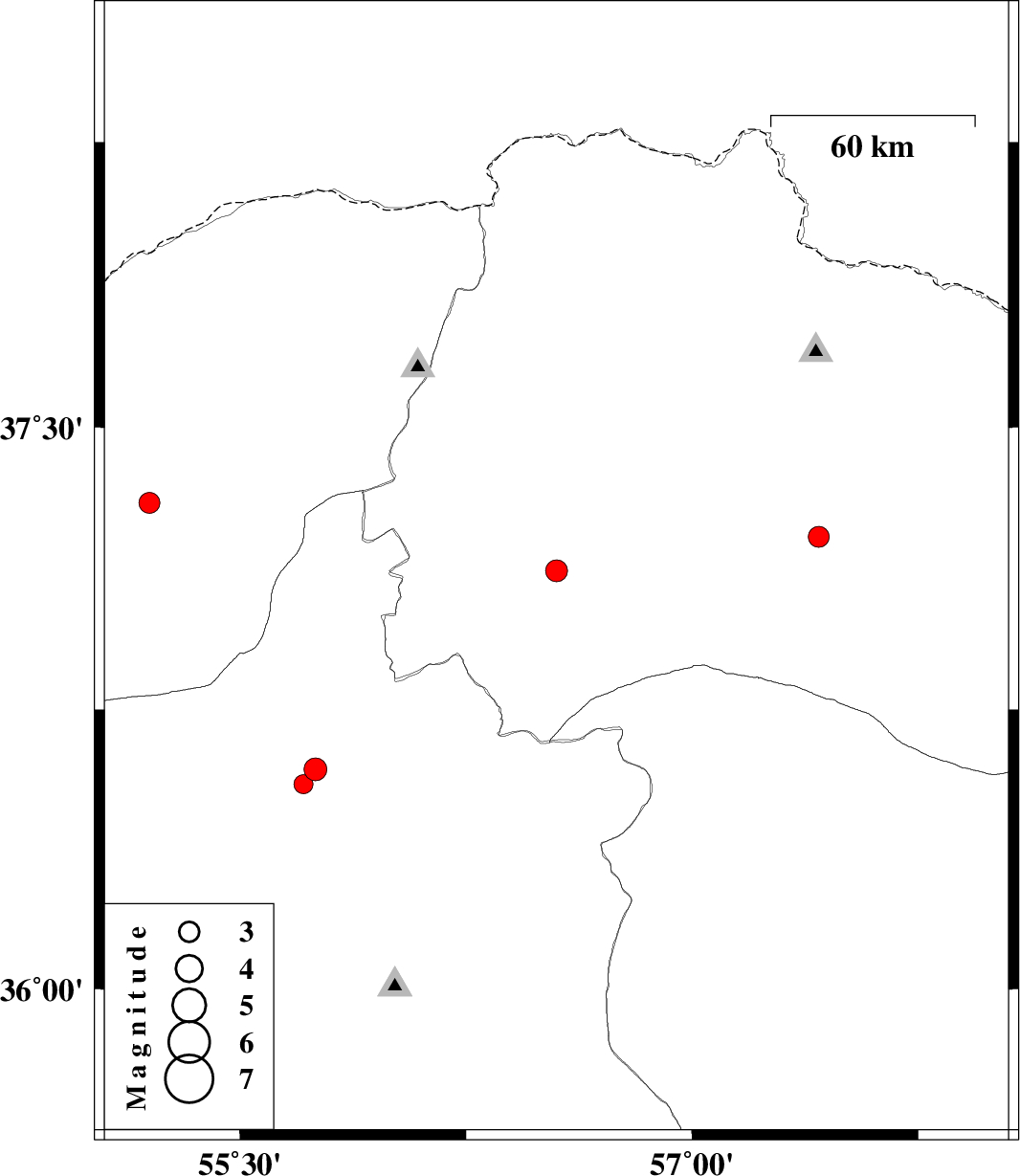 | 2009/01/13 | 03:45:01.6 | 07:15:01.6 | 37.12 | 56.55 | 18 | ML:3.2 | 23 km North-East of Jajarm, Khorasan(north) Province | ||