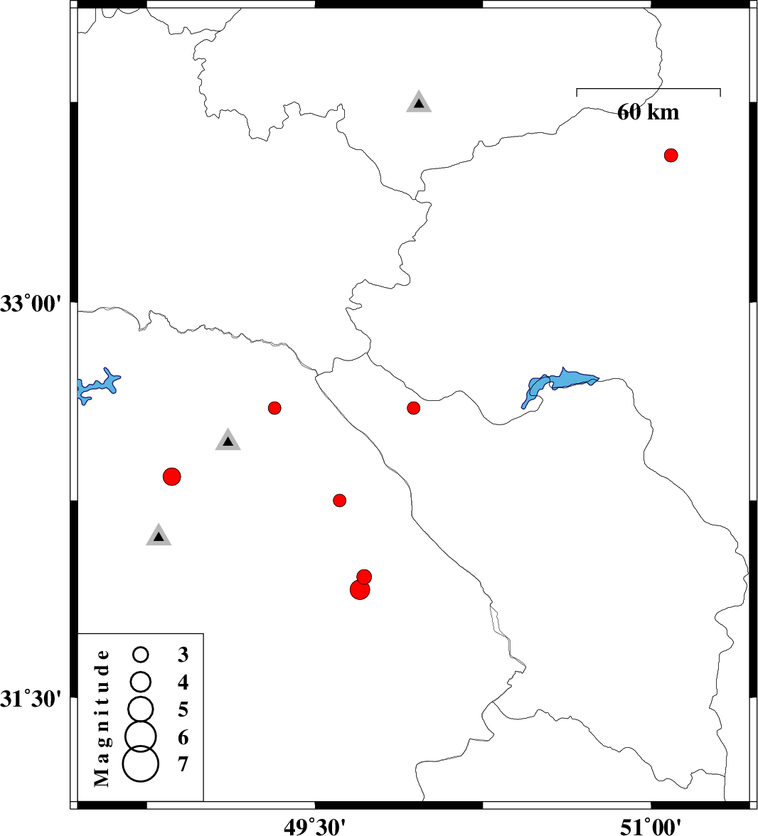 | 2009/01/07 | 01:19:01.3 | 04:49:01.3 | 31.91 | 49.7 | 45 | ML:4 | 17 km West of Izeh, Khoozestan Province | ||