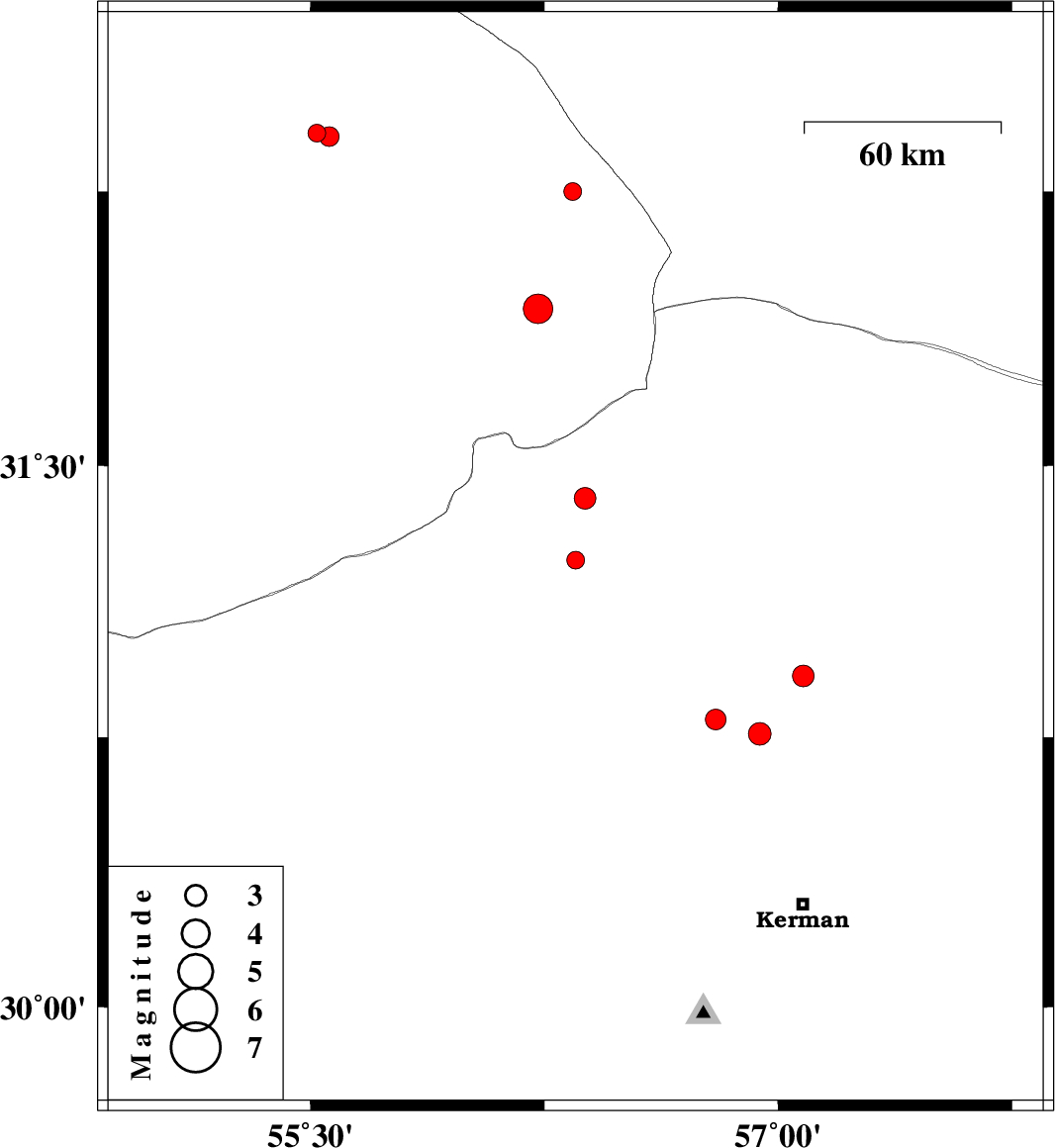 | 2008/12/20 | 06:13:06.3 | 09:43:06.3 | 30.92 | 57.08 | 15 | ML:3.1 | 45 km South-East of Ravar, Kerman Province | ||