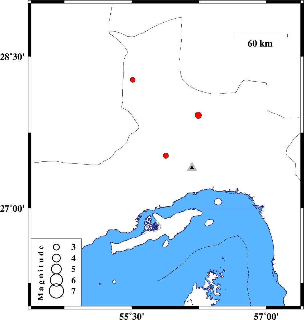 | 2009/01/11 | 23:26:10.0 | 02:56:10.0 | 28.27 | 55.51 | 15 | ML:2.6 | 39 km West of Hajiabad, Hormozgan Province |