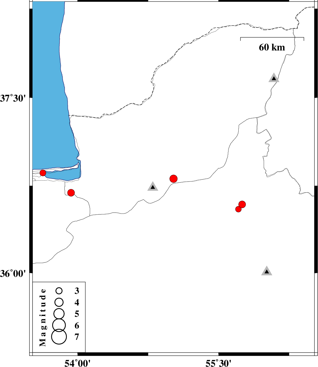 | 2008/12/27 | 03:15:17.9 | 06:45:17.9 | 36.86 | 53.63 | 15 | ML:3 | Caspian Sea, 20 km North of Behshahr |