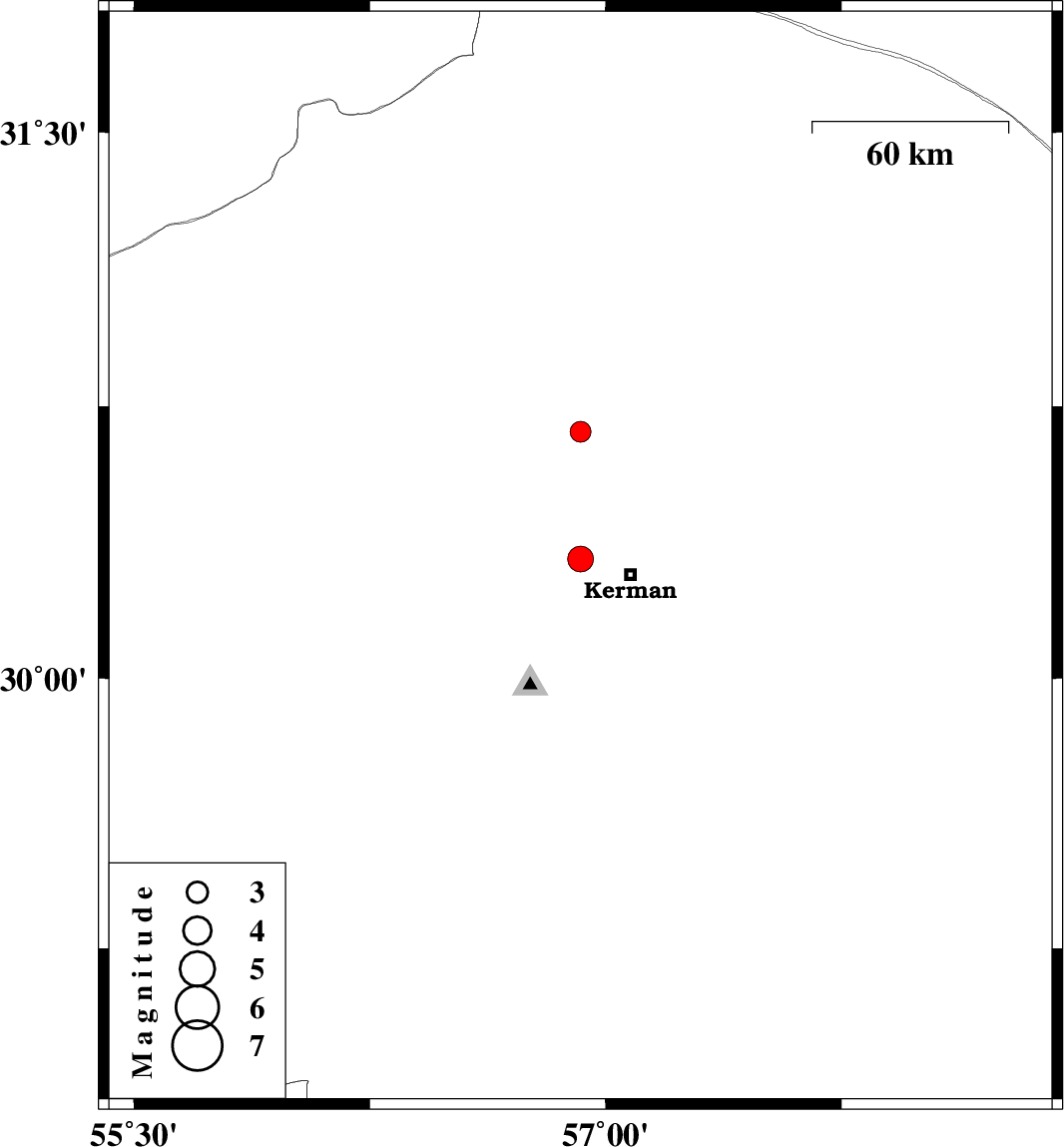 | 2009/01/24 | 05:54:54.7 | 09:24:54.7 | 30.33 | 56.92 | 15 | ML:3.6 | 15 km West of Kerman, Kerman Province | ||